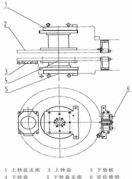 機器的上、轉盤位于機身的喉口里面,是由圓錐滾子軸承支撐其旋轉。凸模和凹模分別裝在上、下轉盤上,各定位銷孔分布在圓周上。該部分由AC伺服電機、定位銷和定位氣缸、減速器等組成。根據CNC指令,模具要換位時,轉盤的定位銷退出,AC伺服電機驅動轉盤到CNCziling要求的下一個模位,當轉到新的指令位置時,電機停下,轉盤定位銷插入,保證了模具的精度定位。如圖4.3所示,電機、減速箱及傳動軸與床身固定。
