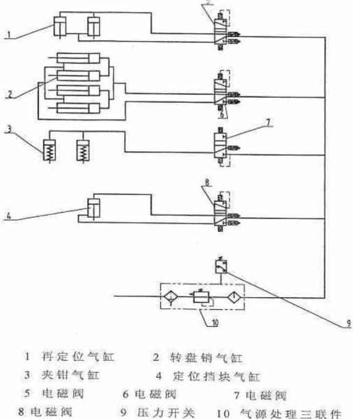 轉盤的上、下兩個定位銷分別由兩個汽缸通過聯(lián)接板與銷子相連,氣缸支持在固定座上,由雙電控二位五通閥控制銷子的進退,定位時的速度可由單向節(jié)流閥調整。