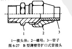 3)位制液壓系統(tǒng)泄漏極為重要,因?yàn)樾孤┖臀帐且簤合到y(tǒng)常見的故障.要控制泄漏,首先,是提高液壓元件零部件的加工精度和元件的裝配質(zhì)量以及管道系統(tǒng)的安裝質(zhì)量。其次,是鍵高密封件的質(zhì)量,注意密封件的安裝使用與定期更換:最后是加強(qiáng)日常維護(hù)。液壓系統(tǒng)中管接頭漏池是經(jīng)常發(fā)生的。一般的B型薄壁管擴(kuò)口式管簇頭的結(jié)構(gòu)如圖所示。