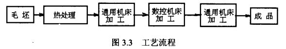 數(shù)控工藝路線設(shè)計(jì)是下一步工序設(shè)計(jì)的基礎(chǔ),其設(shè)計(jì)的質(zhì)量會(huì)直接影響零件的加工質(zhì)量與生產(chǎn)效率。設(shè)計(jì)工藝路線時(shí)應(yīng)對(duì)零件圖、毛坯圖認(rèn)真分析,結(jié)合數(shù)控加工的特點(diǎn)靈活運(yùn)用普通加工工藝的一般原則,盡量把數(shù)控加工工藝路線設(shè)計(jì)得合理一些。因此,在工藝路線設(shè)計(jì)中一定要注意到,由于數(shù)控加工工序一般都穿插于零件加工的整個(gè)工藝過(guò)程中,因而要與其他加工工藝銜接好,常見(jiàn)的工藝流程如圖3.3所示。
