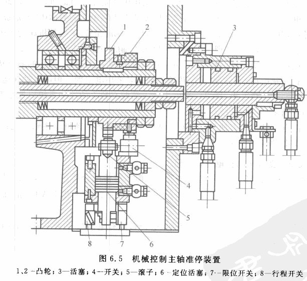 采用機械控制的主軸準停裝置定向比較可靠、精確,但結構復雜。如圖6.5所示,主軸準停裝置設在主軸尾端,當主軸需要停車換刀時,發出降速信號,主軸箱自動改變傳動路線,使主軸換到低速運轉;時間繼電器延時數秒后,開始接通無觸點開關4;當凸輪2上的感應片對準無觸點開關時,發出準停信號,立即切斷主電動機電源,脫開與主軸的傳動聯系,以消除傳動系統中大部分旋轉零件的慣性對主軸準停的影響,使主軸作低速空轉;再經過時間繼電器的短暫延時,接通液壓油,使定位活塞6帶動定位滾子5向上運動,并壓緊在凸輪1的外表面。當主軸帶動凸輪l慢速轉至其上的V形槽對準滾子5時,滾子進入槽內,使主軸準確停止,同時限位開關7發出信號,表示已完成準停。如果在規定的時間內限位開關7未發出完成準停信號,即表示滾子5沒有進入V形槽,這時時間繼電器發出重新定位信號,并重復上述動作,直到完成準確停止;然后,定位活塞6退回到釋放位置,行程開關8發出相應的信號。