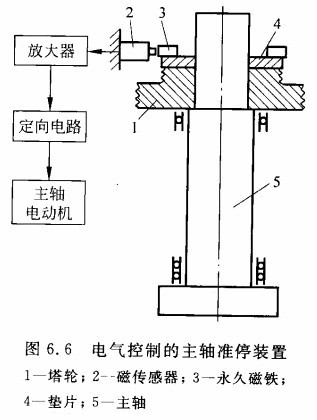 這種準停裝置如圖6. 6所示,它利用裝在主軸上的磁性傳感器作為位置反饋元件,由其輸出信號,使主軸準確停在規定位置上。此種裝置不需要機械部件,可靠性高,準停時間短,只需簡單的強電順序控制,且有較高的精度和剛性,是目前加工中心普遍采用的電控準停裝置。