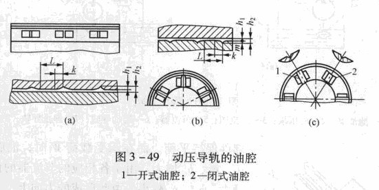 工作臺等,其泊腔開在運動部件上,如圖3 -49 (a)所示。但由于運動部件上進油困難,故仍從固定導軌進泊,油腔也可刻在固定導軌上,如圖3 -49 (b)所示。它可用于直線運動導,軌,也可用于圓運動導軌。