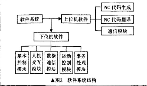 系統(tǒng)軟件主要包括上位機(jī)軟件和下位機(jī)軟件兩部分,如圖2所示。上位機(jī)軟件主要負(fù)責(zé)NC代碼生成、翻譯以及與下位機(jī)和其它PC機(jī)通信;下位機(jī)軟件主要包括5大模塊:基本控制模塊、數(shù)據(jù)通信模塊、運(yùn)動(dòng)控制模塊、人機(jī)交互模塊及事務(wù)處理模塊”1。