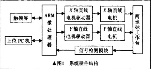 改進(jìn)后的系統(tǒng)硬件結(jié)構(gòu)框圖如圖l所示。上位機(jī)為PC機(jī),通過(guò)串口與下位機(jī)ARM通信,下位機(jī)控制觸摸屏和直線電機(jī)。