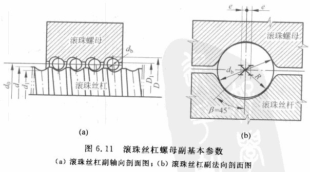 此外還有絲杠螺紋大徑d、絲杠蝶、紋小徑dl、螺紋全長i、滾珠直徑db、螺母螺紋大徑D、螺母螺紋小徑隊、滾道圓弧偏心距e以及滾道圓弧半徑R等參數。