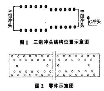 該生產線上所用沖壓機床有A、B、C3組沖頭.分別用來負責3個沖壓工位的加工,可用于加工各種不同型號的零件。在該沖壓機床的3組沖頭中.A、B工位的兩組沖頭在結構上很類似,部是由兩捧組成,每排各有6個,即執行1次沖壓動作便可完成12個孔的加工.C工位只有1個沖頭.3組沖頭的結構布局見圖l。根據廠家的生產需求,該機床所要加工零件的示意圖見圖2(根據實際需要,也可只加工3個沖壓工位中的1個或2個工位)。其中,靠近零件最外面的兩排孔是由A組沖頭沖壓得到的.最里面的一排孔是由C沖頭沖壓得到的,剩余的兩排孔是由B組沖頭沖壓得到的。對于不同的零件.3個沖壓工位的孔間距.孔邊距以及各工位孔的加工數量是可以不同的,以便于加工出廠家所需要的各種零件。