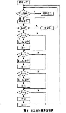 (3)加工控制這是整個控制系統的核心部分。在加T控制模塊的編程過程中.充分考慮到機床實際加工時的各種工作狀態,如手動加工與自動加工、單次加工與循環加工、自動復位、自動回零點等操作。編寫掃描函數來對運動控制卡的各個口子的狀態進行定期的掃描.以確定機床當前的工作狀態.做出適當的分析,發出相應的指令,保證整個系統的正常運行。加工控制程序流程圖地圖4。