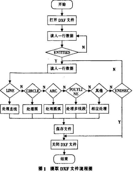 數控沖床在編制程序時需要的只是圖形的幾何信息,而DXF文件中的ENIITIES段保存了圖形圖像的所有幾何信息,因此只要編寫ENTITIES段就可完成DXF文件的準確輸出,其余段可忽略。在讀取DXF文件時只需要提取直線的兩個端點.圓弧的圓心坐標、半徑、起始角、終止角,圓的圓心坐標、半徑,矩形的4個頂點等。DXF文件數據讀取和處理流程圖見圖t。