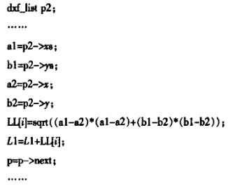 放的H.而繪圖的順序是不固定的,因此必須對實體圖形各個元素進行排序,將直線元素保存在雙向鏈表中,讓各個元素的首節點和尾節點首尾相連組成封閉環.可以得到一個新的鏈表pl。這個鏈表中保存的信息就是零件圖主視圖的外輪廓線。然后找出該鏈表中直線長度等于板料厚度的元素,即主視圖中兩側短豎線,并以此為分界點,提取出一個新鏈表p2。p2中所包含的元素為主視圖中的5段直線,最后將p2中每條直線的長度相加即可得尺寸Ll。部分程序如下: