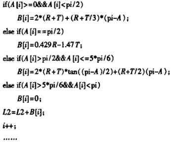 折彎部分伸長量與板科的厚度r、折彎角A、折彎半徑R等因素有關。板料厚度r和折彎半徑尺由外部輸入參數得到,折彎角^通過計算鏈表p2中各相鄰直線的夾角獲得,并將各種夾角的值放在教組A中,得到每個折夸處的伸長量放在數組B中。可以根據公式分別進行計算: