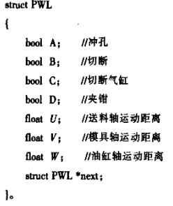 通過讀取DXF文件,可以得到要加工的孔中心相對于原點的坐標,并根據孔的類型和大小選擇模具型號,根據要加工孔的位置和自動選擇的模具號碼,來確定送料軸、模具軸和油缸軸的運動距離。我們建立如下結構來保存加工代碼: