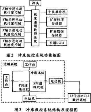 沖床作業件是沖頭.x、Y向送料機構驅動電動機選用2臺步進電動機,控制器是單片機。由高性能的單片機對步進電動機的位置和速度進行控制,以滿足加工精度要求。控制原理如下:從單片機發出的高低電平通過光電隔離裝置控制步進電動機正反轉,輸出的控制脈沖個數控制電動機的轉角,輸出脈沖頻率控制電動機的轉速。系統功能框圖如圖2所示,結構原理框圖如圖3所示。