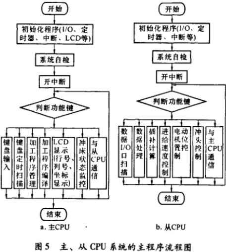 系統的軟件設計必須以硬件為載體,根據硬件電路實現的功能編寫相應的程序集。根據硬件電路的主從式CPU結構,數控系統的軟件也包括主CPU軟件和從CPU軟件,各包括多個功能模塊。主從CPU系統的主程序流程網如圖5所示。