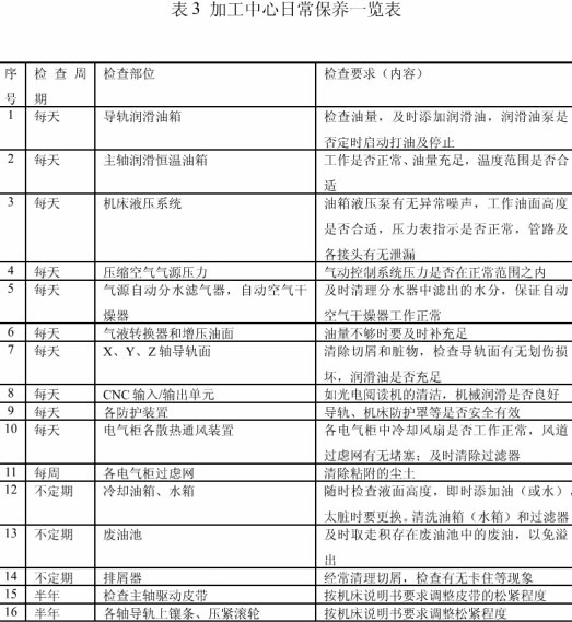 常用的數(shù)控機(jī)床切削精度檢測(cè)驗(yàn)收內(nèi)容如表2下附上某加工中心日常保養(yǎng)維護(hù)(表3),以供制訂有關(guān)保養(yǎng)制度時(shí)參考。