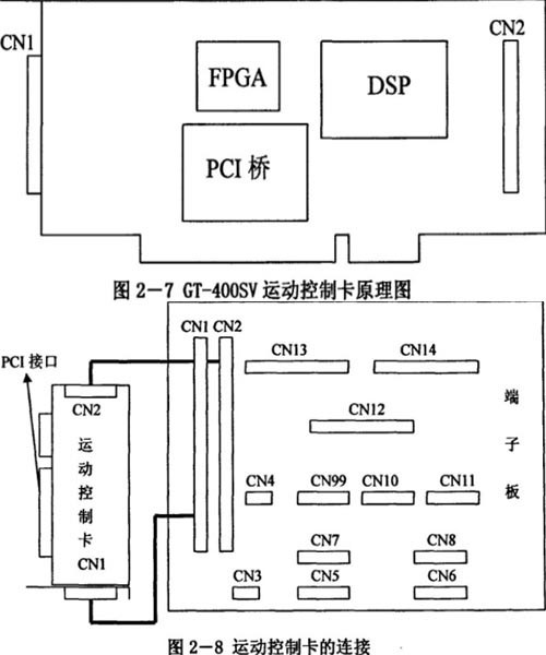 下面以固高的一款PCI運動控制卡GT-400SV為例介紹其原理。結構原理圖如圖2-7所示;DSP(數字信號處理器)是一種微處理器,也是此運動控制卡的運算核心。FPGA(現場可編程門陣列)是一種可編程邏輯器件,可以以開發軟件的形式開發硬件,實時改變器件功能。PCI橋是專門用于PCI接口板和PC通訊的器件。CNI和CN2是運動控制卡控制端的輸入輸出口。其中CN1為62管腳,控制四個軸及編碼器;CN2也為62管腳,控制通用輸入輸出。